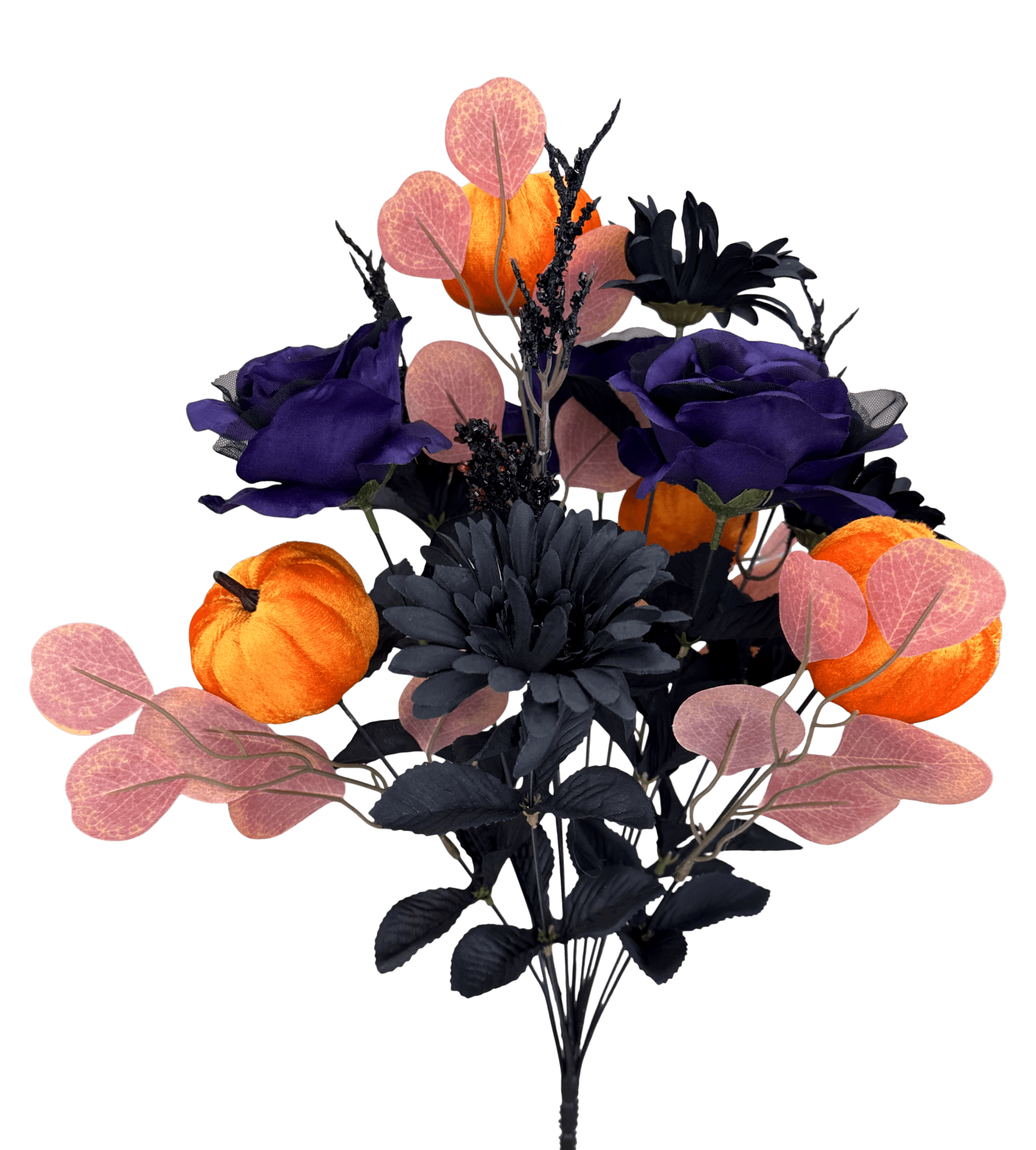 Who says spooky can’t be stylish? This 21" Halloween bush features a hauntingly beautiful mix of deep purple roses, black florals, glittered foliage, soft pink eucalyptus-style leaves, and plush orange pumpkins. With 14 wired stems, it's a full-bodied stunner perfect for wreaths, centerpieces, or standing alone in a vase. The ultimate pick for gothic glam, witchy elegance, or candy-cute Halloween décor.