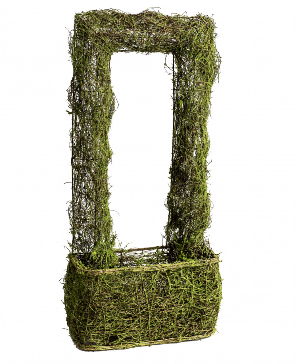 This garden basket is made of angel vine and grape vine covered in a generous amount of moss flocking.  The rectangular "handle" is a hollow convex curve, making it ideal for poking flower stems through for a cascading effect. 11.5" wide x 26" Tall x 4" Deep. Pocket is 6.5" Tall.