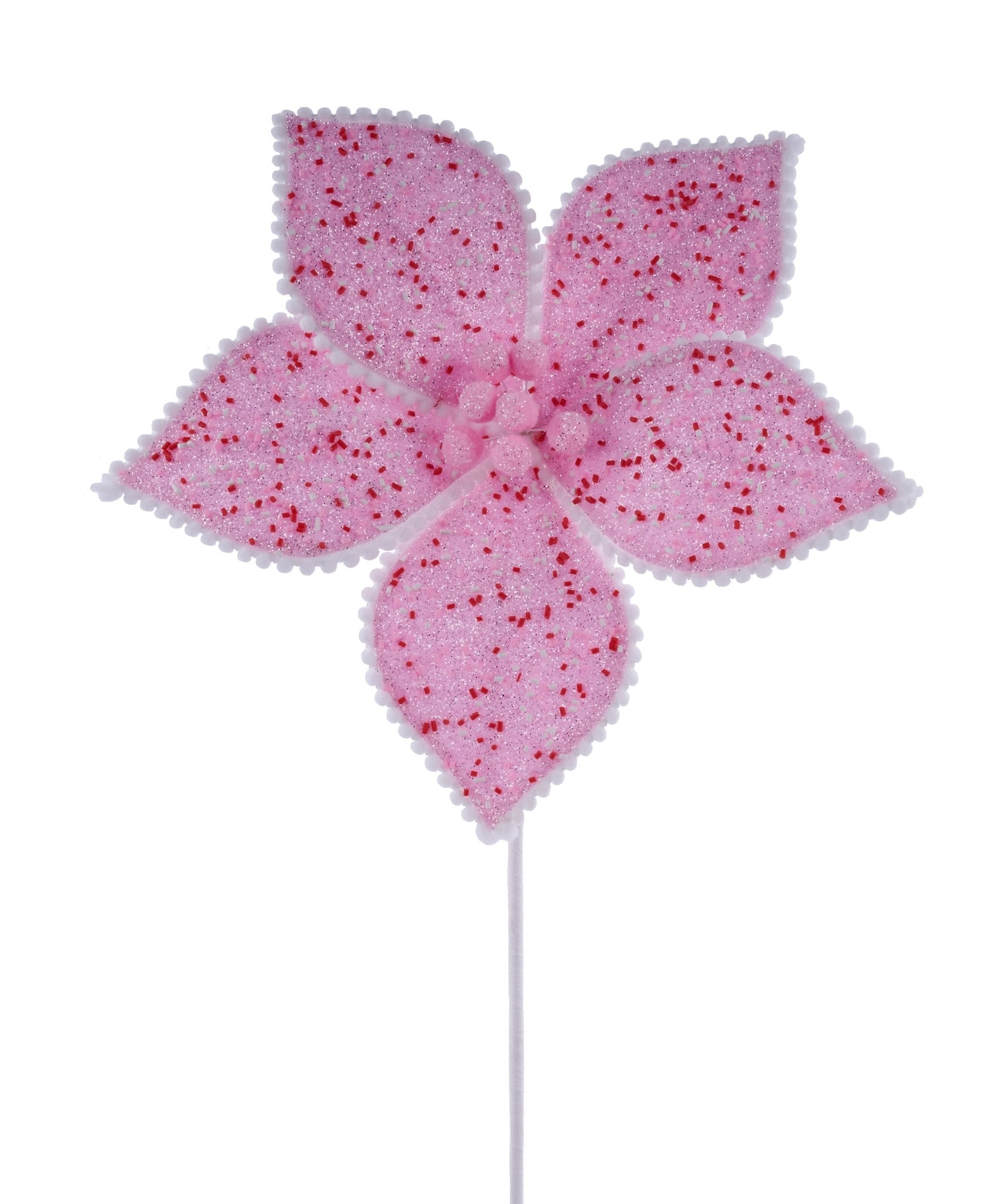 Sweet, sparkly, and full of personality — this 22" Pink, Red, and White Glitter Sprinkles Snowball Poinsettia Stem is pure holiday fun! Covered in frosted texture, candy-like sprinkles, and playful shimmer, it brings that Whoville magic to your Grinch-themed, peppermint, or candyland Christmas designs. Perfect for whimsical trees, wreaths, and garlands that need a pop of pink and a sprinkle of sass.