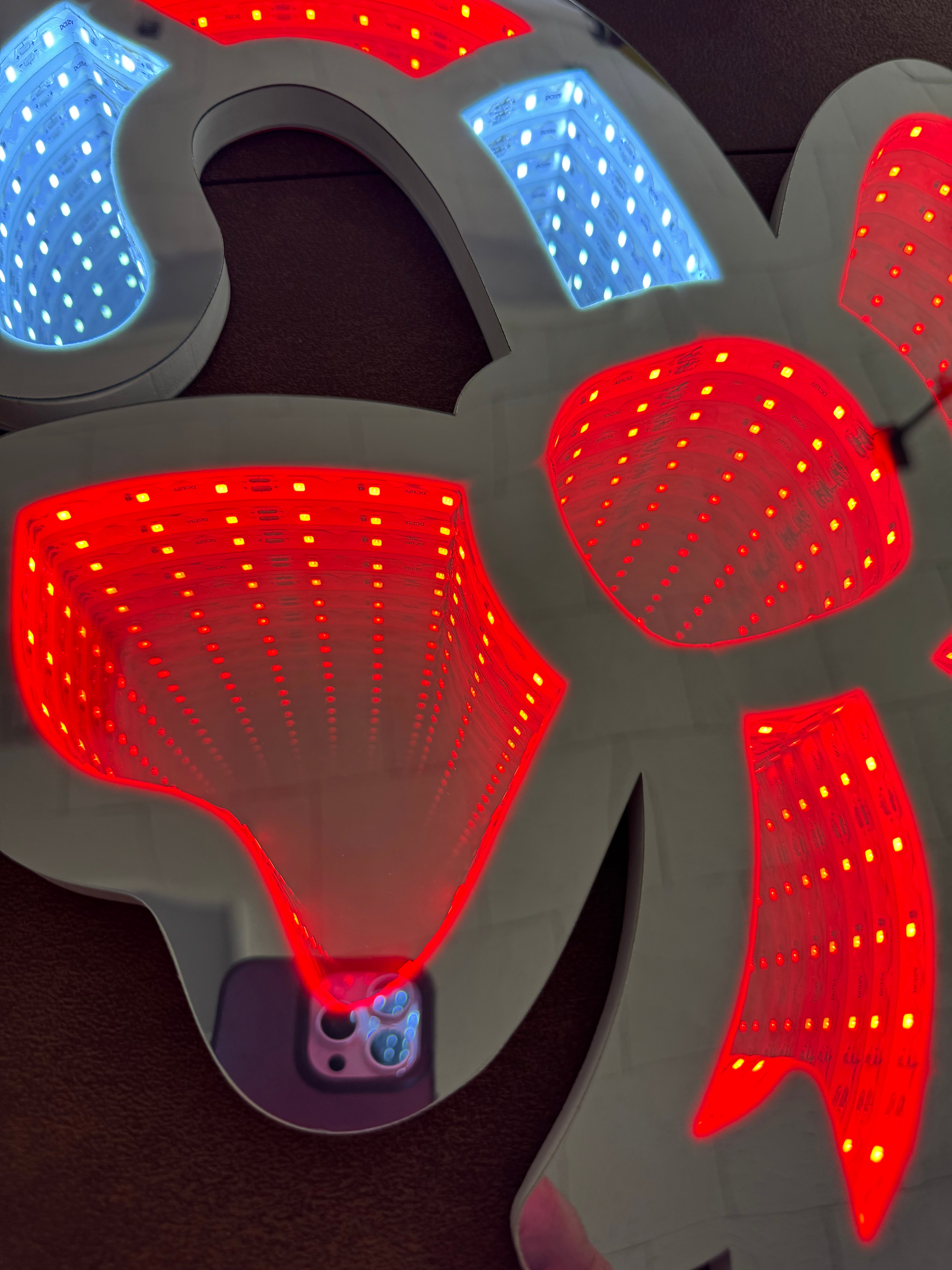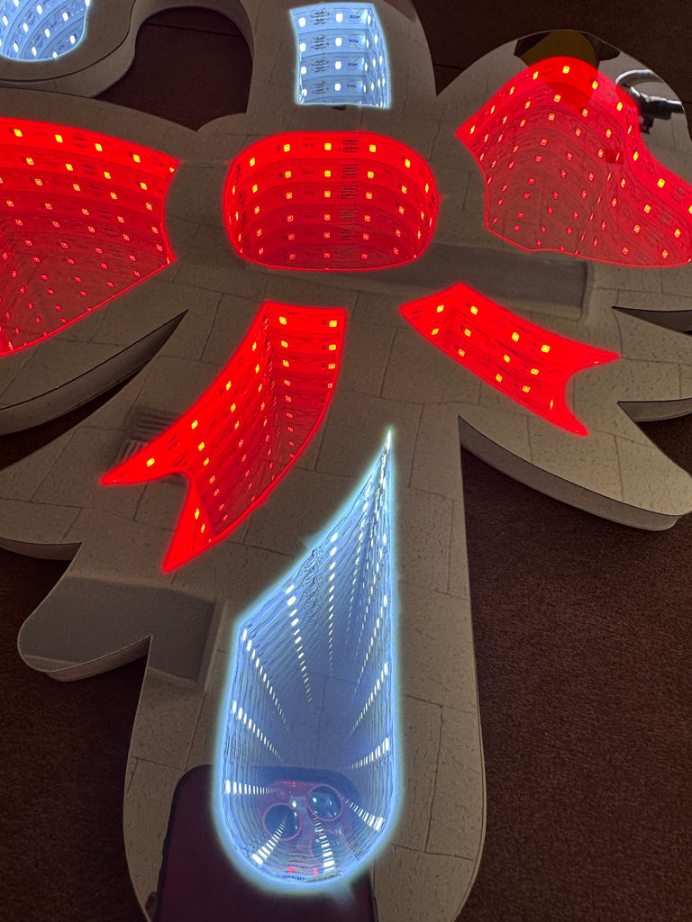 Shine bright this holiday season with the Designers Excellence 17.75" LED Infinity Hanging Candy Cane in red and cool white. Featuring a dazzling infinity light effect, this glowing candy cane ornament is perfect for candy-themed Christmas décor, windows, entryways, or tree displays. The bold red and white LED lights with a festive bow design add whimsical sparkle and modern flair to your holiday decorating.