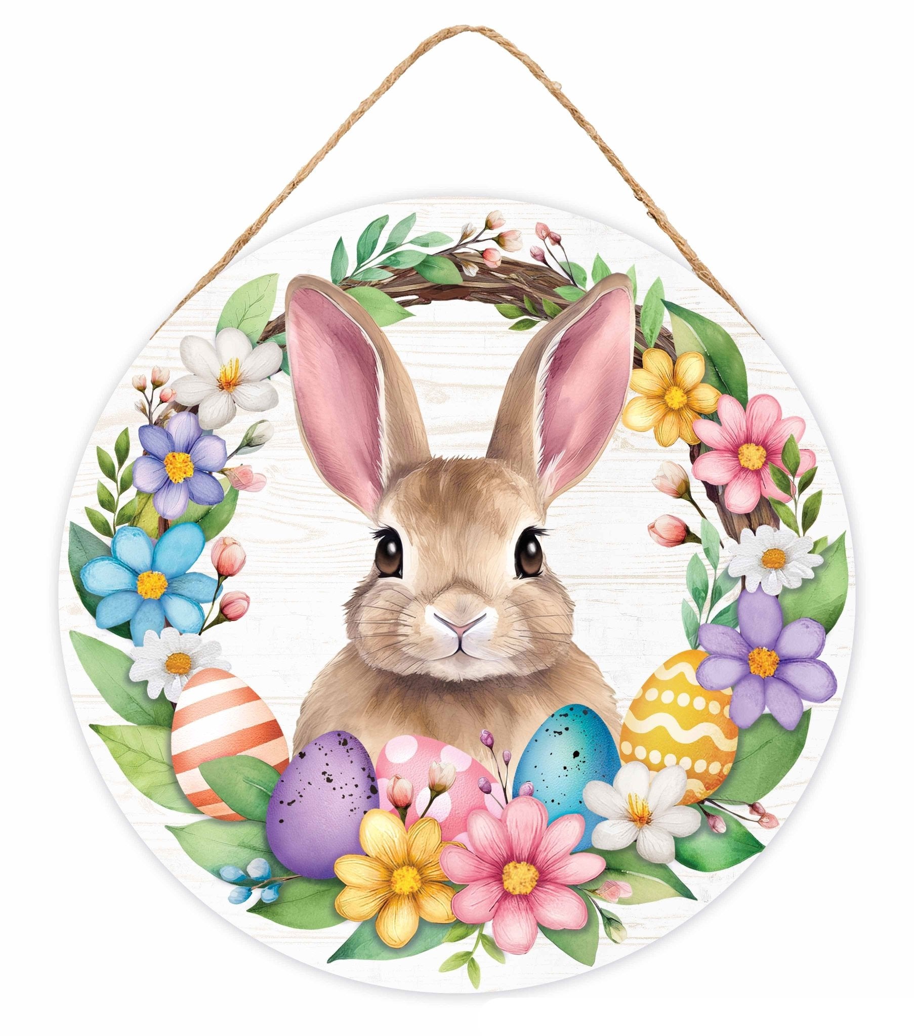 Add a sweet springtime touch to your wreaths and seasonal décor with this charming Bunny Floral Egg Wreath sign. Featuring an adorable bunny surrounded by pastel Easter eggs and vibrant florals, this round sign instantly creates a soft, welcoming look perfect for the season.