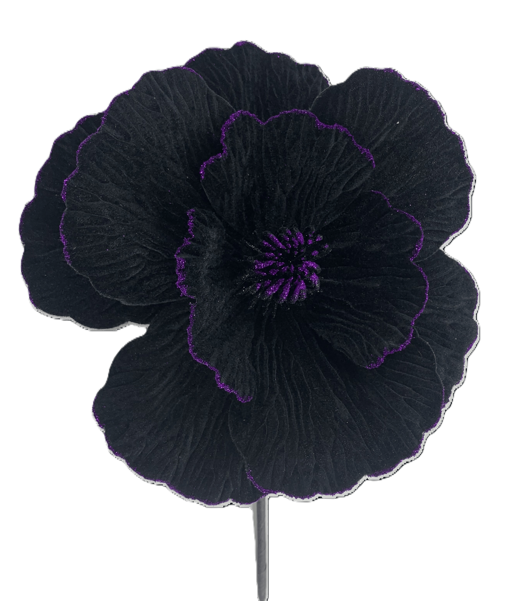 Make a bold statement with our 11" Fantasy Flower Pick in rich black velvet accented by shimmering purple glitter. With layered petals and deep dimension, this oversized bloom is perfect for Halloween, pastel goth, glam, or alternative floral designs.