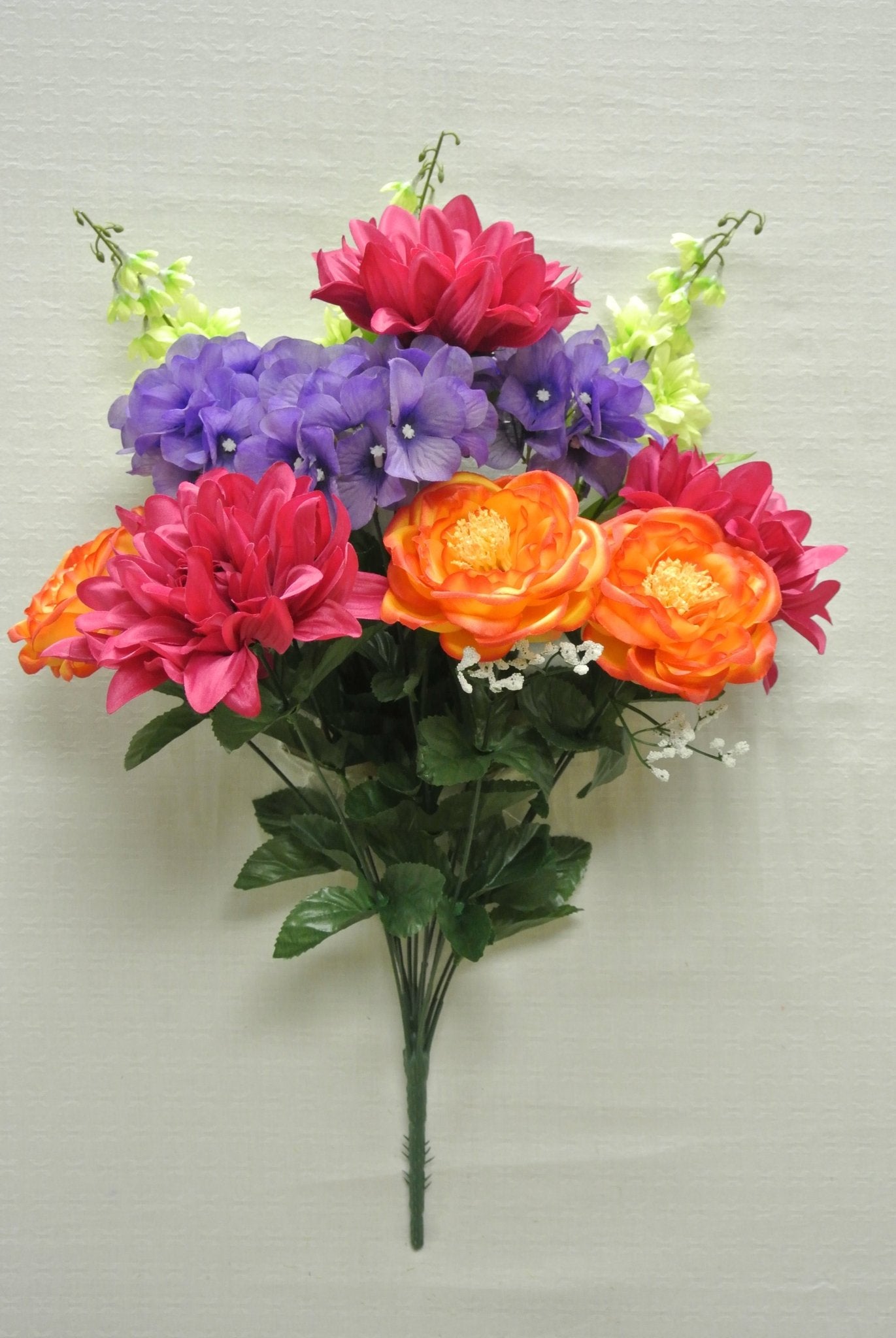 Brighten your floral designs with this vibrant 22-inch Dahlia & Ranunculus Spray featuring bold fuchsia, orange, and purple blooms. This eye-catching floral stem combines layered dahlia-style flowers, ranunculus blooms, and delicate filler accents to create a full, colorful arrangement perfect for statement designs.