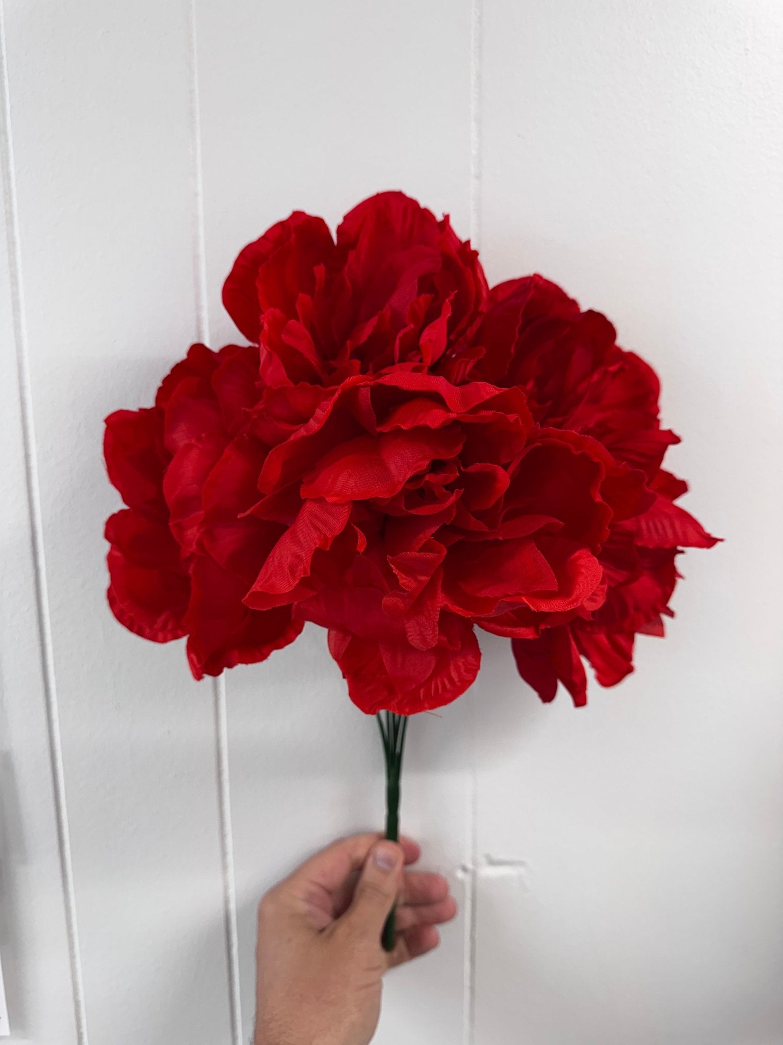 Add bold color and fullness to your next design with this stunning 17-inch Red Peony Bush. Featuring 5 large blooms per bush, each bloom measures approximately 6 inches wide for a full, premium look. The rich red color makes it perfect for patriotic wreaths, Valentine’s designs, Christmas arrangements, everyday florals, and statement décor.