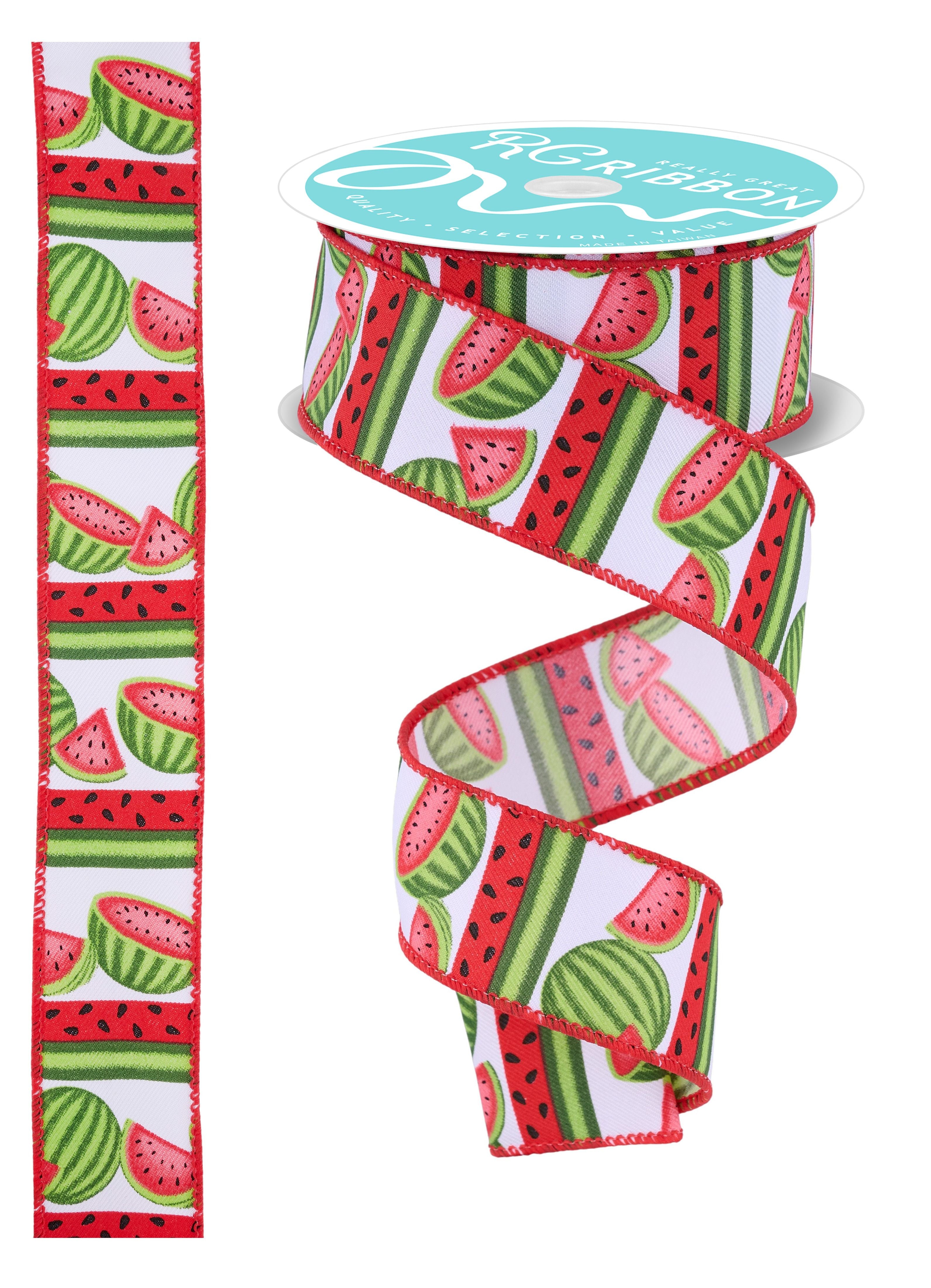Add a fresh pop of summer to your designs with this 1.5-inch Watermelon Ribbon. Featuring bright red and pink watermelon slices with vibrant green rinds against a crisp white background, this ribbon is bursting with cheerful seasonal charm.