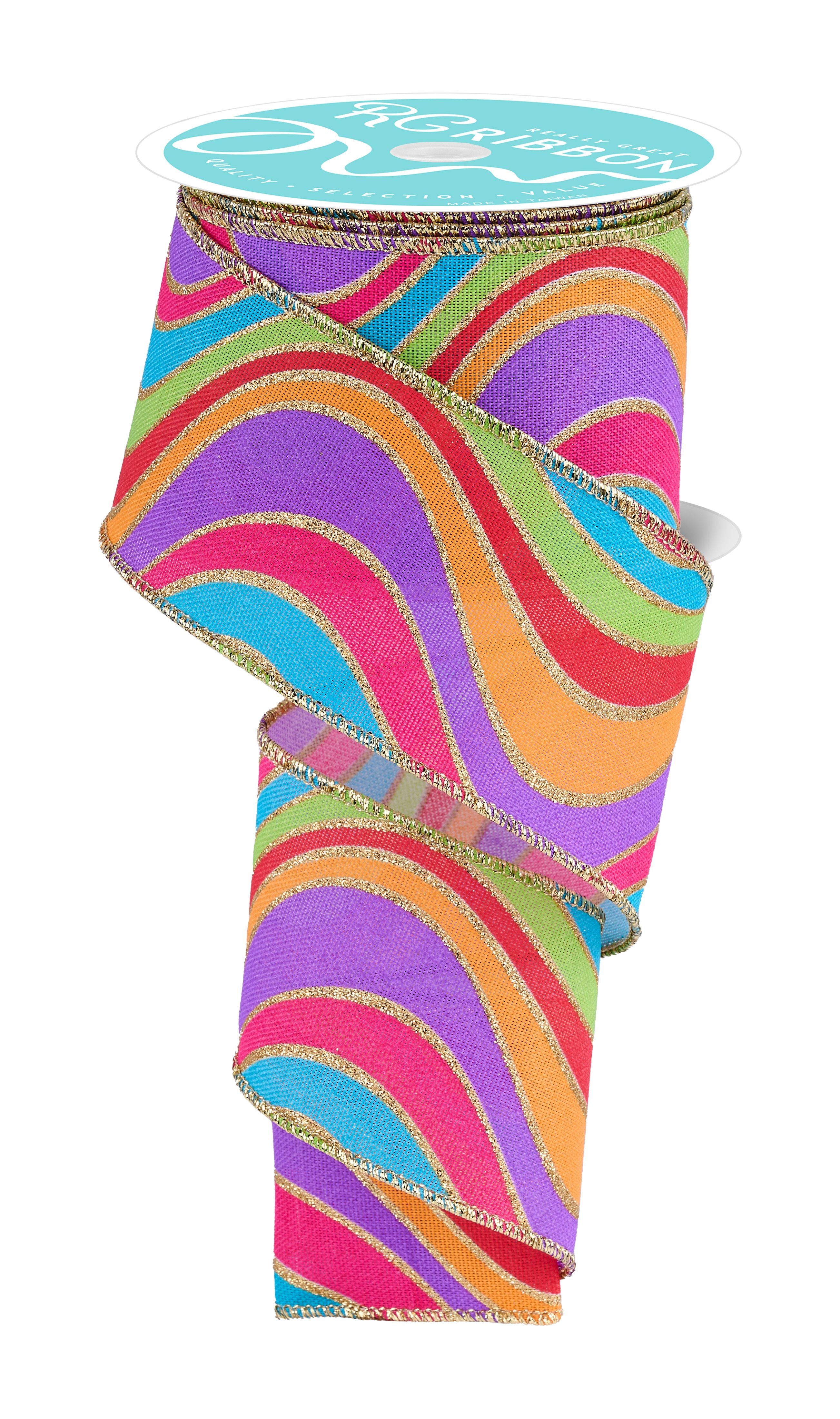 Add bold movement and vibrant color to your designs with this 2.5-inch Multicolor Wavy Stripe Ribbon. Featuring flowing waves of purple, orange, red, lime, and bright hues accented with shimmering gold detailing, this ribbon brings a fun, energetic look to any project.