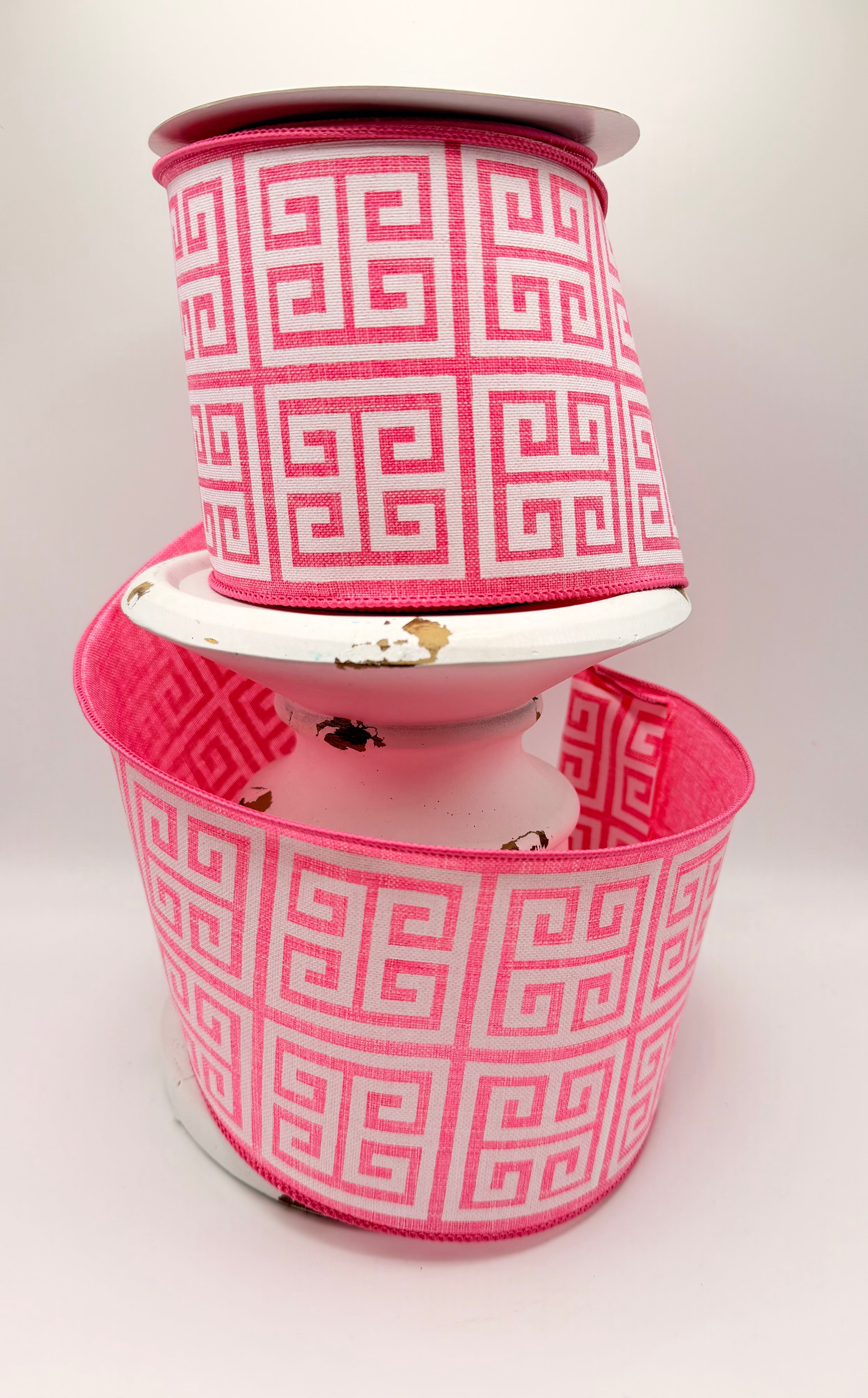 Bring classic elegance and bold pattern to your designs with this 4-inch Greek Key Ribbon featuring a timeless Pink Greek key pattern on a white royal canvas background. The iconic geometric design adds a sophisticated touch that works beautifully for wreaths, bows, and decorative accents.