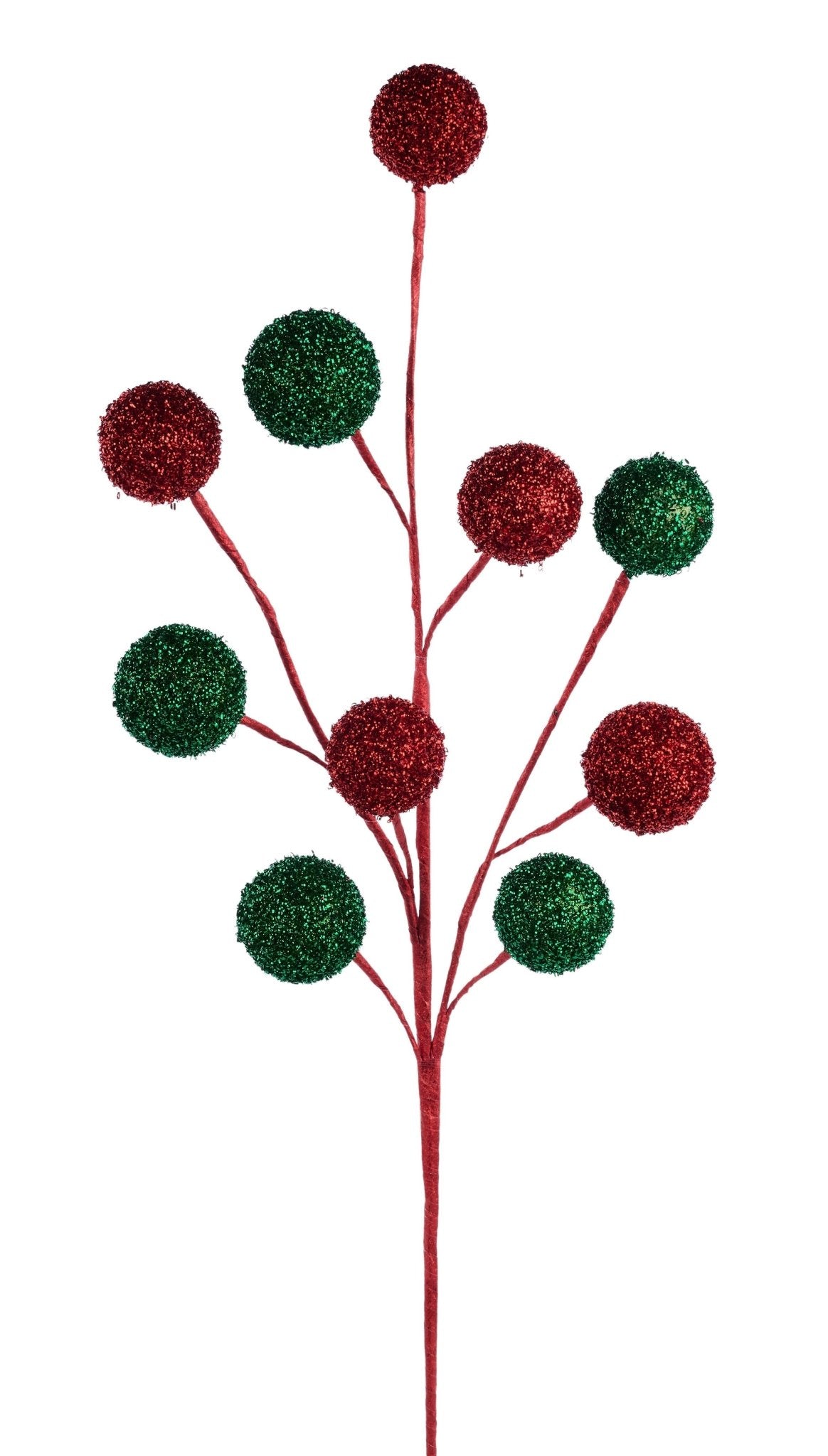 Bring bold holiday sparkle to your designs with this 26" red, emerald green foil ball spray. Each sphere shimmers with a fine glitter finish that adds texture and shine, perfect for filling out Christmas trees, wreaths, garlands, or floral arrangements. Its wired stems make shaping and styling simple — giving your creations that full, dimensional look every designer loves.
