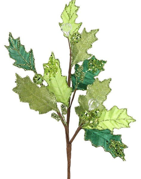 Create a tasteful floral display with the help of this lovely velvet holly/berry spray! This spray features glitter-dusted lime/emerald holly leaves, plump berries and twisty twigs, allowing it to fit in marvelously with other colorful floral pieces! House this spray in a wreath display, or use it in a decorative pot or planter to make the most of its good looks!