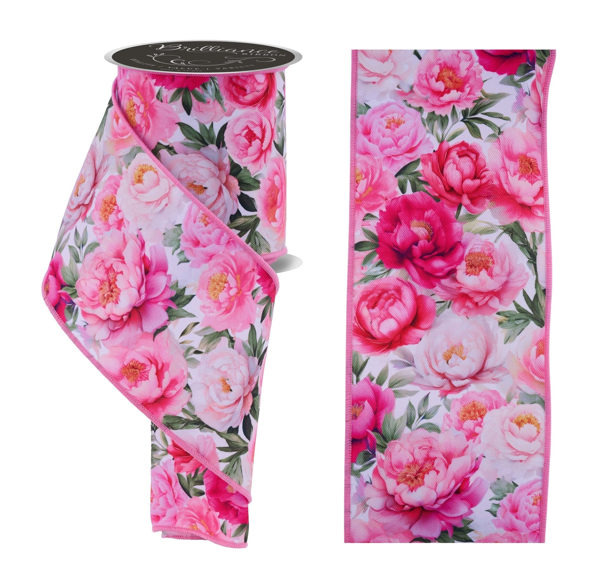 Brilliance 4" x 10yd Peony Floral Ribbon – White & Multi Pink | LS1214WT