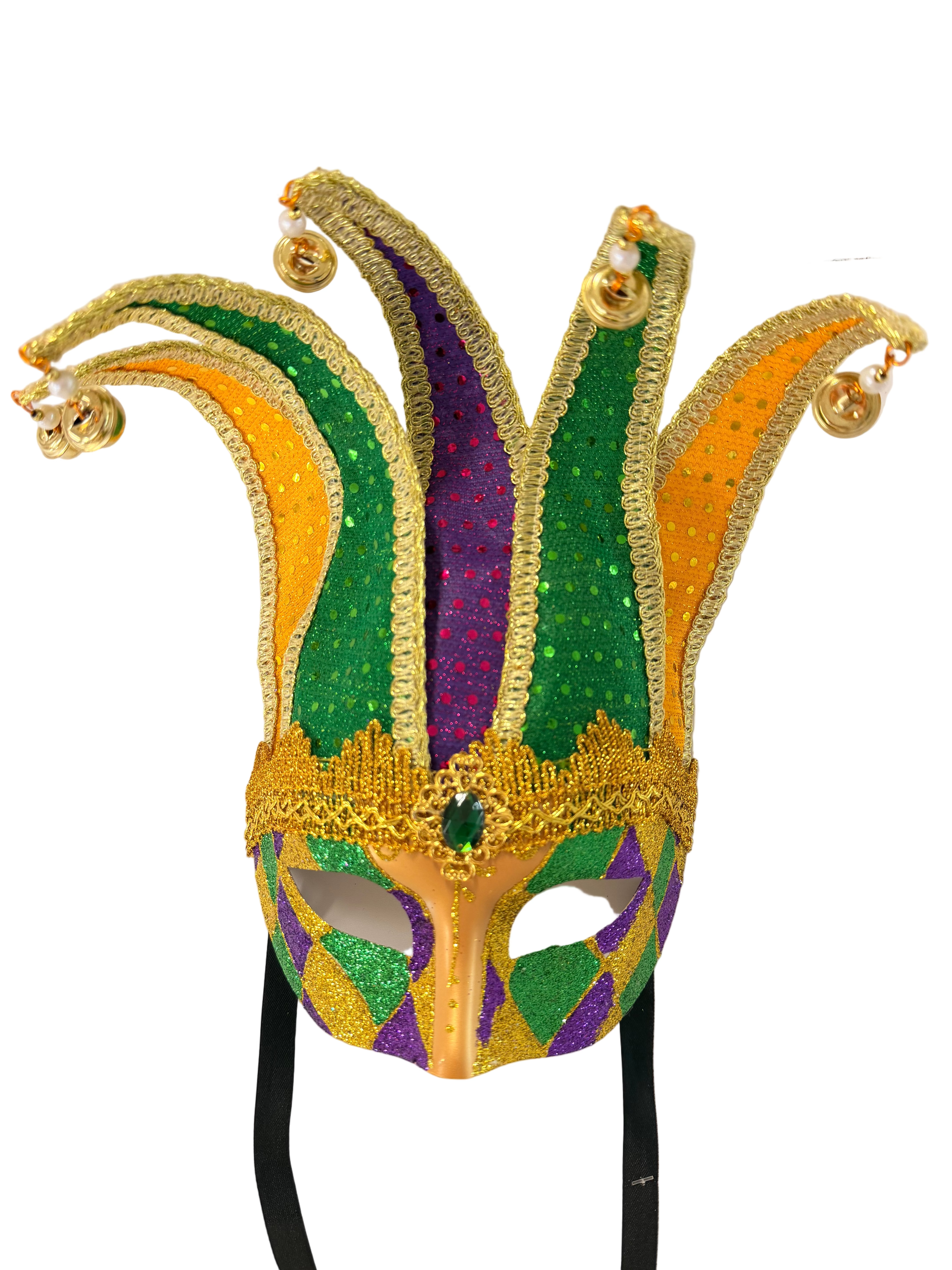 Add dramatic Mardi Gras elegance with this Harlequin-style jester eye mask featuring 7 crowned fabric points accented with bells and beads. Rich glitter patterning and bold PGG colors make it perfect for wreaths, displays, décor, or costume wear.