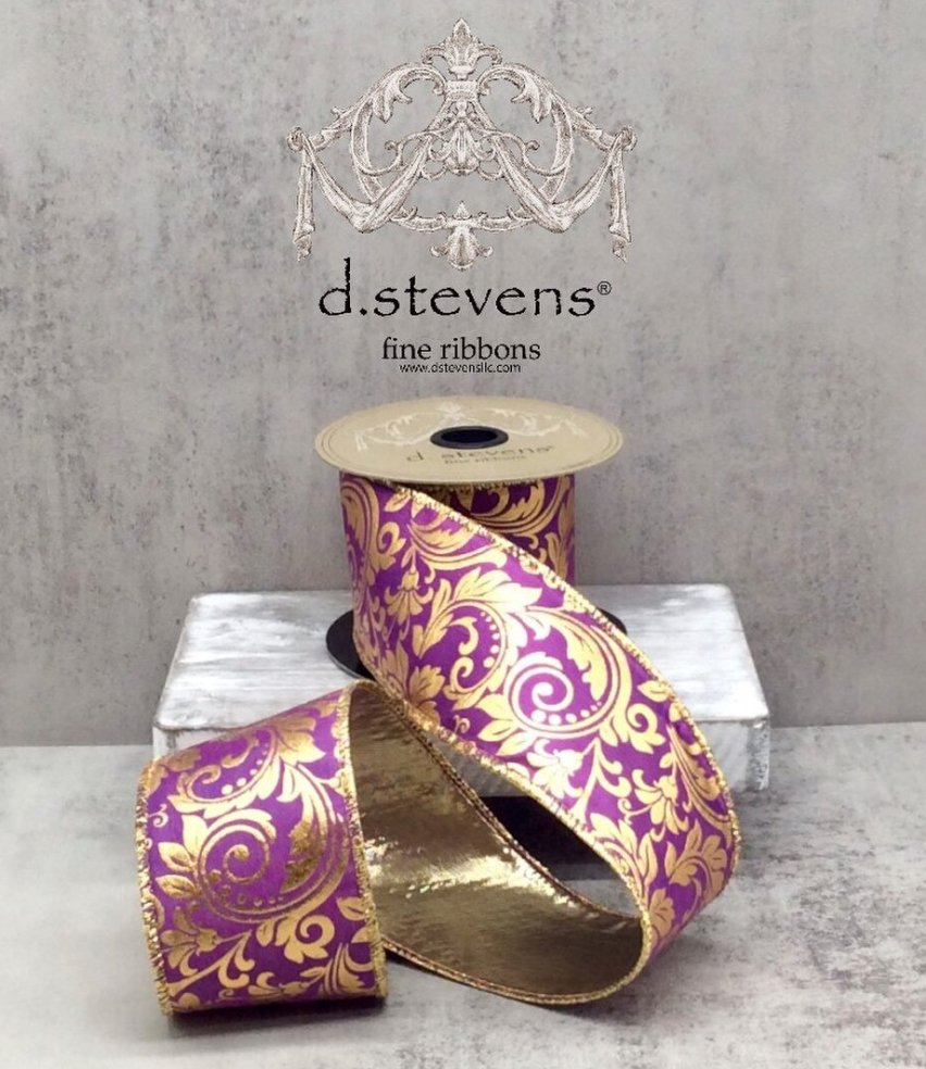Elevate your holiday and event designs with the D. Stevens 2.5" Taffeta Gold Foil Acanthus Ribbon. Featuring a royal purple base with ornate gold foil acanthus leaves and a shimmering gold backing, this ribbon exudes elegance and sophistication.