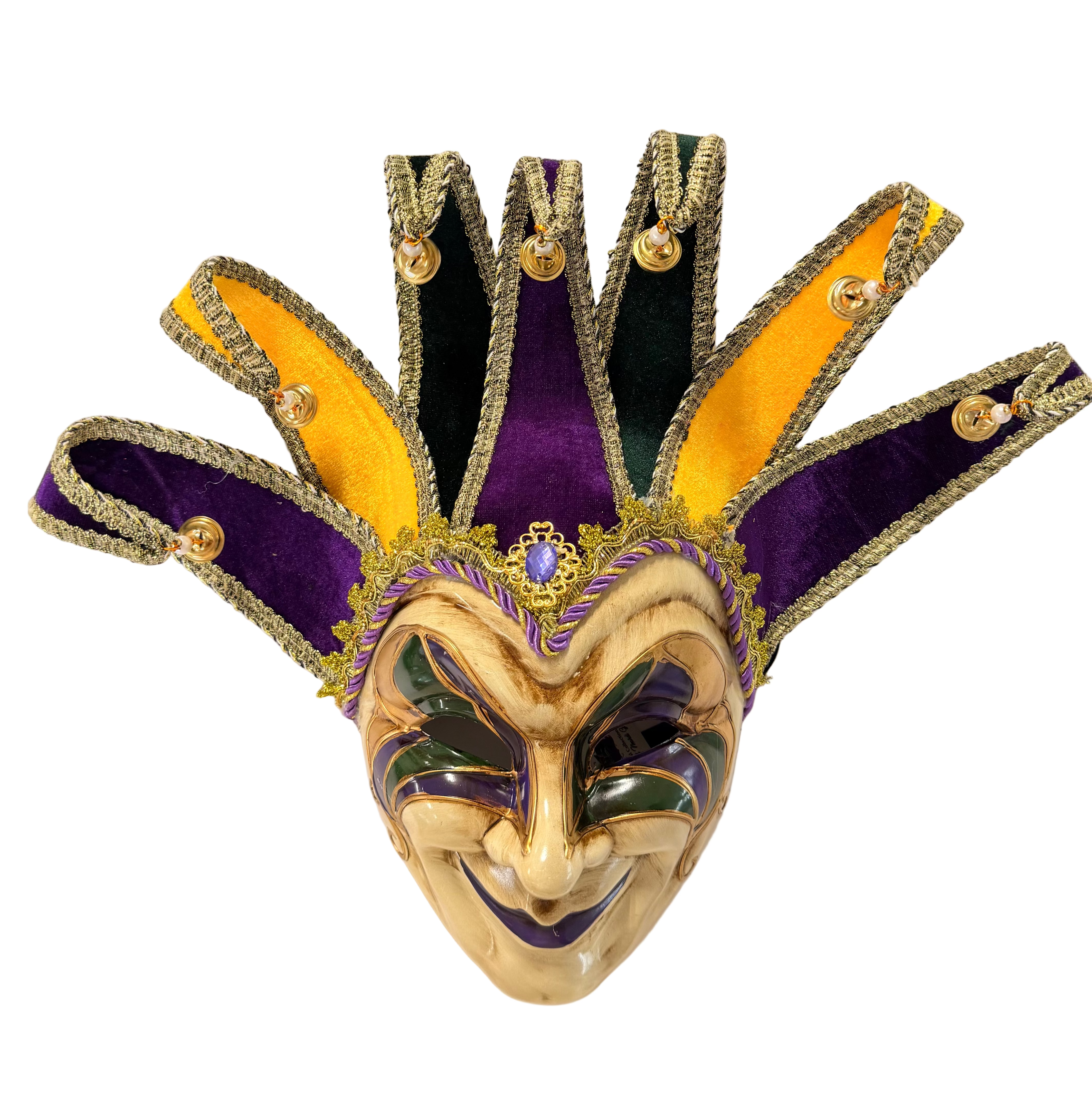 Create a show-stopping Mardi Gras look with this full-face jester mask featuring 7 crowned points, glitter detailing, jewel embellishments, and a traditional PGG color palette. Perfect for krewe members, costume balls, parades, events, and dramatic décor.
