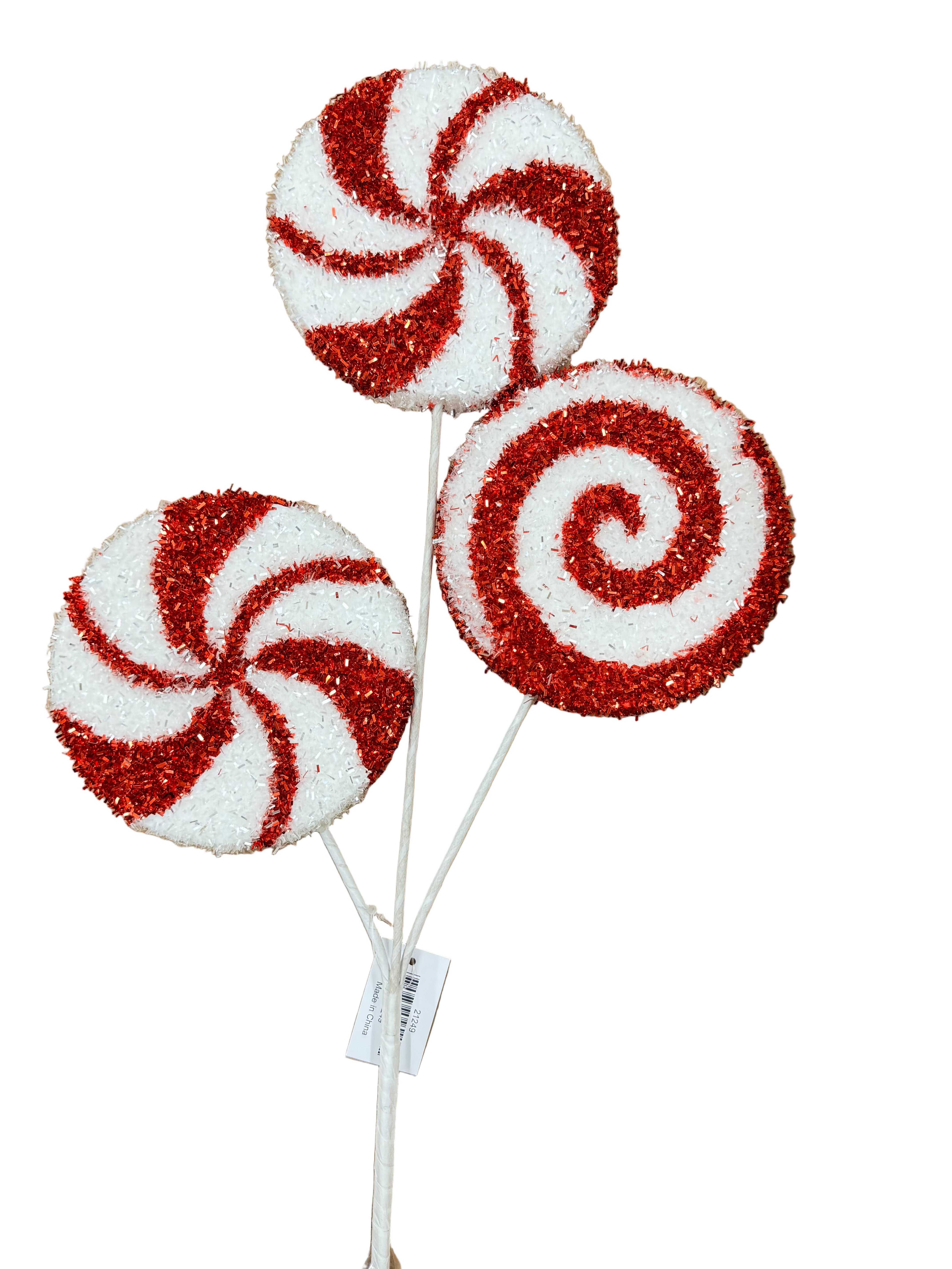 Sweeten your Christmas décor with this 24" Tinsel Peppermint Spray. Featuring three glittery red and white peppermint candy discs with swirl and pinwheel designs, this festive spray adds sparkle and whimsy to holiday trees, wreaths, garlands, and centerpieces.