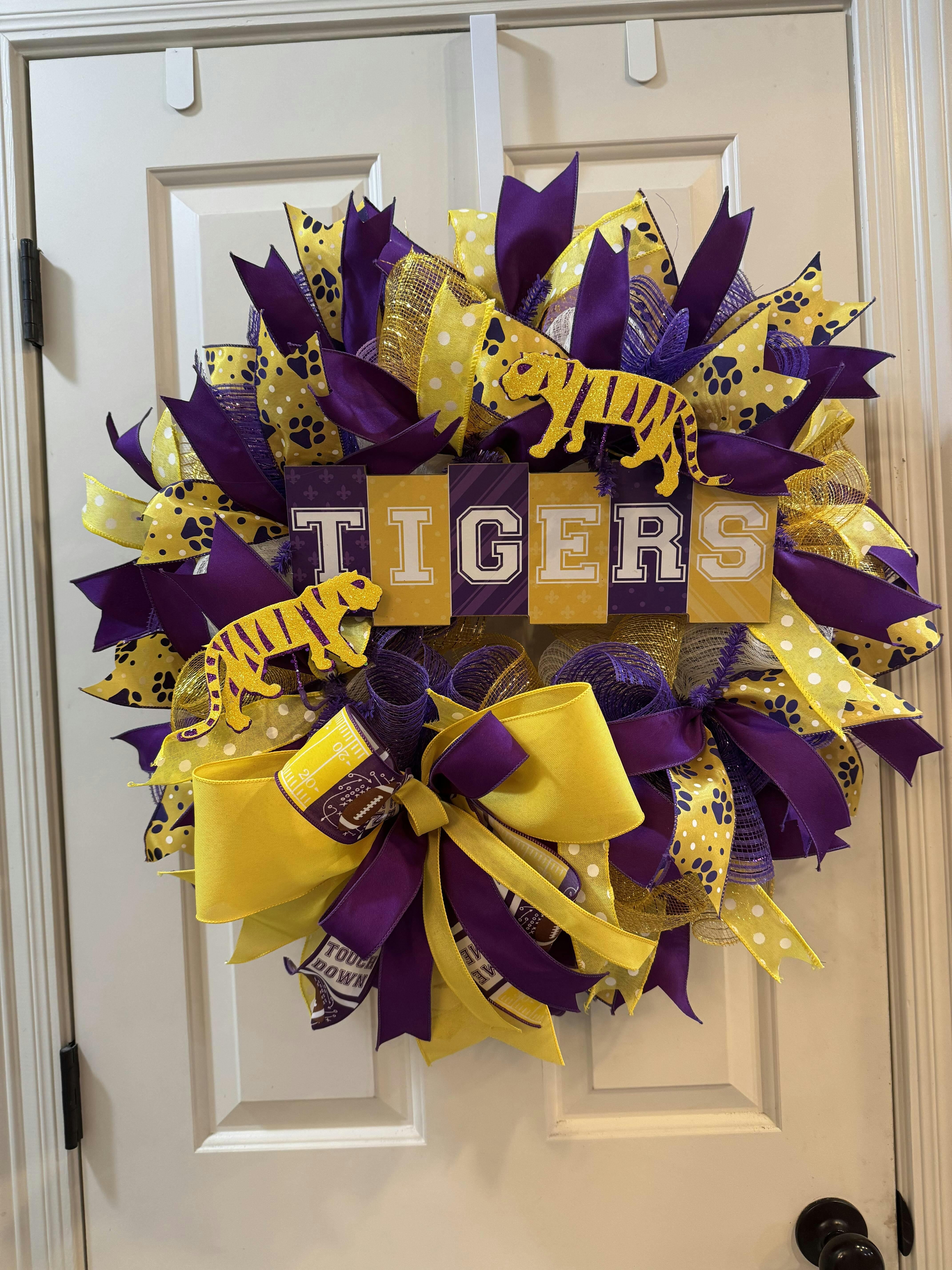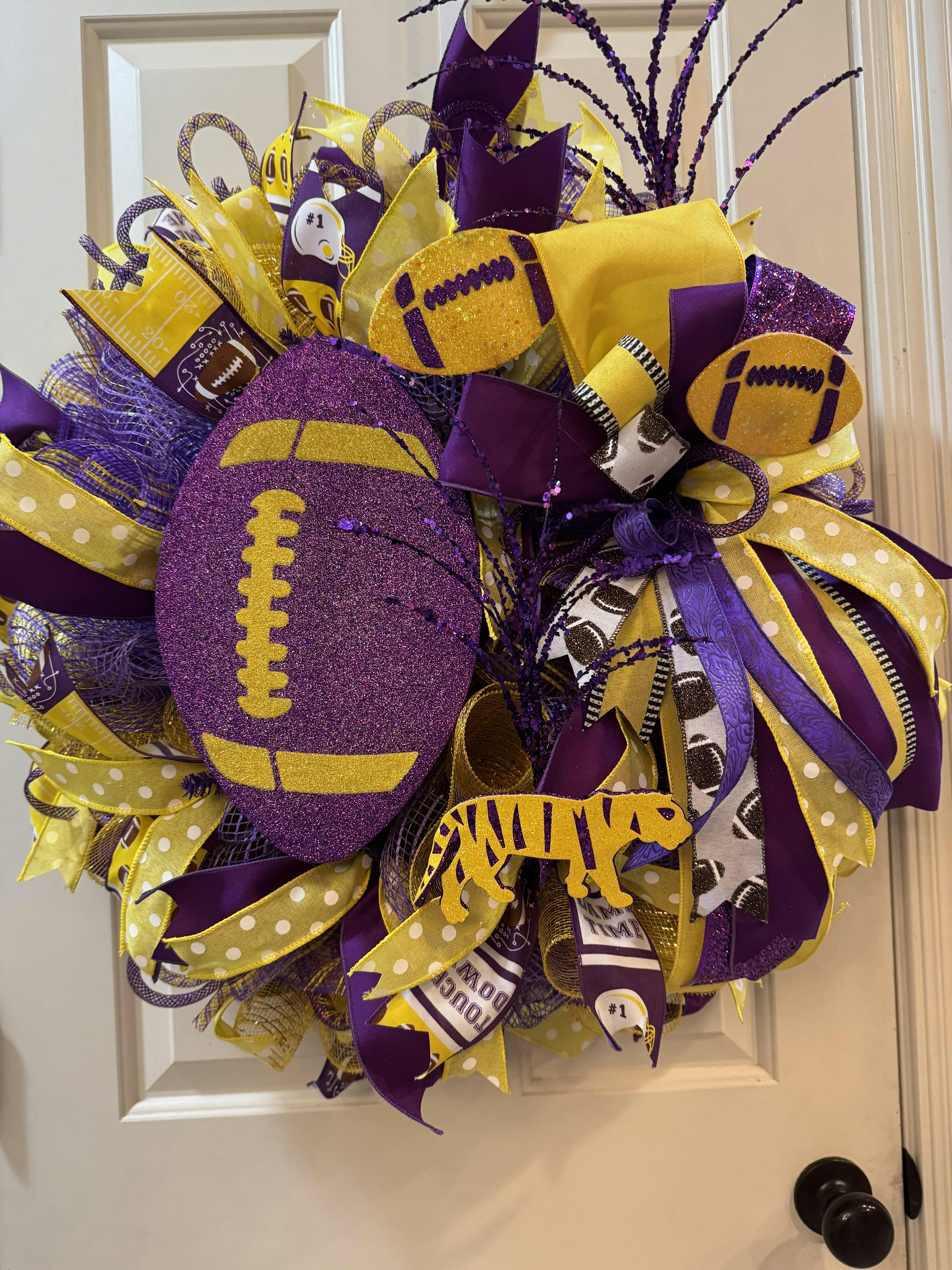 Go tigers! Pay tribute to the almighty champs with this glitter football/tiger pick! This pick will work perfectly in a wreath display for your favorite school, and team! Featuring glittery spikes, with three tigers and two footballs, this pick will look striking alongside matching ribbon, other complementary picks, and even a football sign! Hang your finished display in the home, or in a dorm, to show some team spirit!