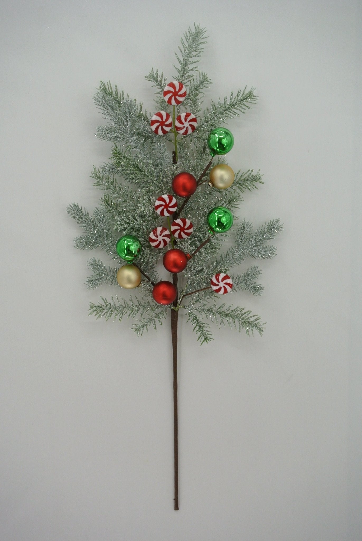 Bring festive charm to your holiday creations with this 30-inch pine ball berry spray. Frosted pine branches are adorned with shiny red, green, and gold ornament balls, plus whimsical red-and-white peppermint candy accents. Perfect for adding color, texture, and sparkle to Christmas wreaths, garlands, centerpieces, or tree designs. The wired stem allows easy shaping and secure placement in any seasonal arrangement.