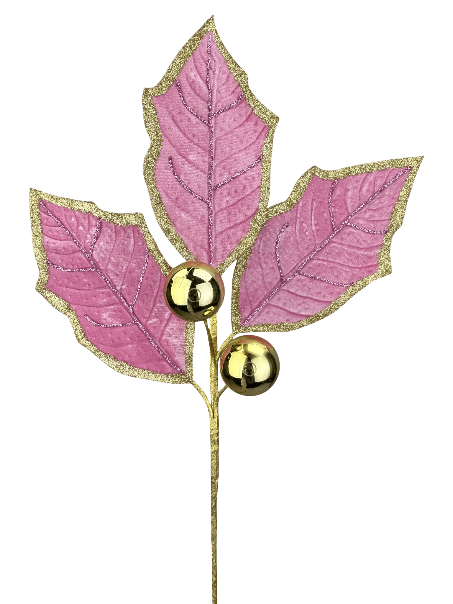 Add a touch of glam to your holiday décor with this 30-inch Pink & Gold Holly Leaf Spray. Featuring three soft pink velvet holly leaves trimmed with sparkling gold glitter and accented by three shiny gold ornaments, this spray combines elegance with festive charm.