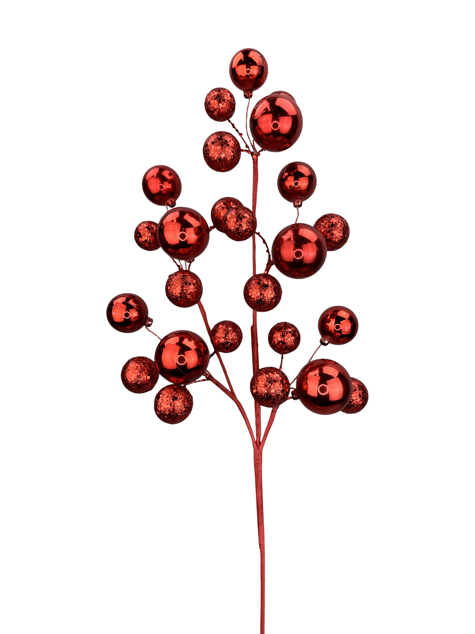 Add festive sparkle to your holiday décor with this 26-inch Glitter & Shiny Ball Spray in Red. Featuring a playful mix of shiny metallic and glittered red balls in varying sizes, this spray instantly brings depth, shine, and cheer to your seasonal arrangements.