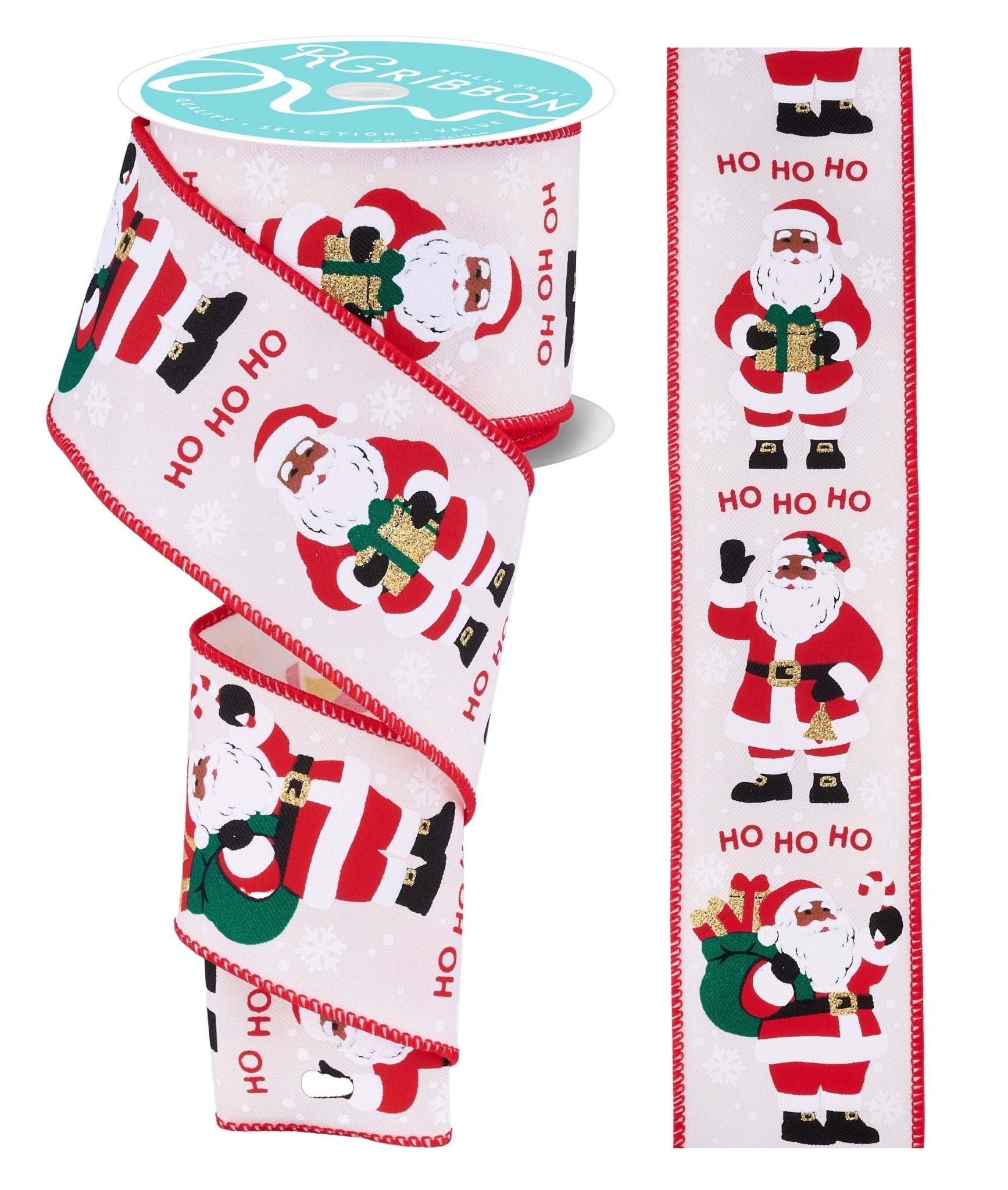 Celebrate this holiday season with this 2.5" Santa Claus ribbon w/ Dark Skin Tone! Featuring a joyful Santa holding gifts, candy canes, and a green toy sack with “Ho Ho Ho” script on a snowy white background. Wired edges make it easy to shape into bows, wreaths, and garlands for cheerful Christmas décor.