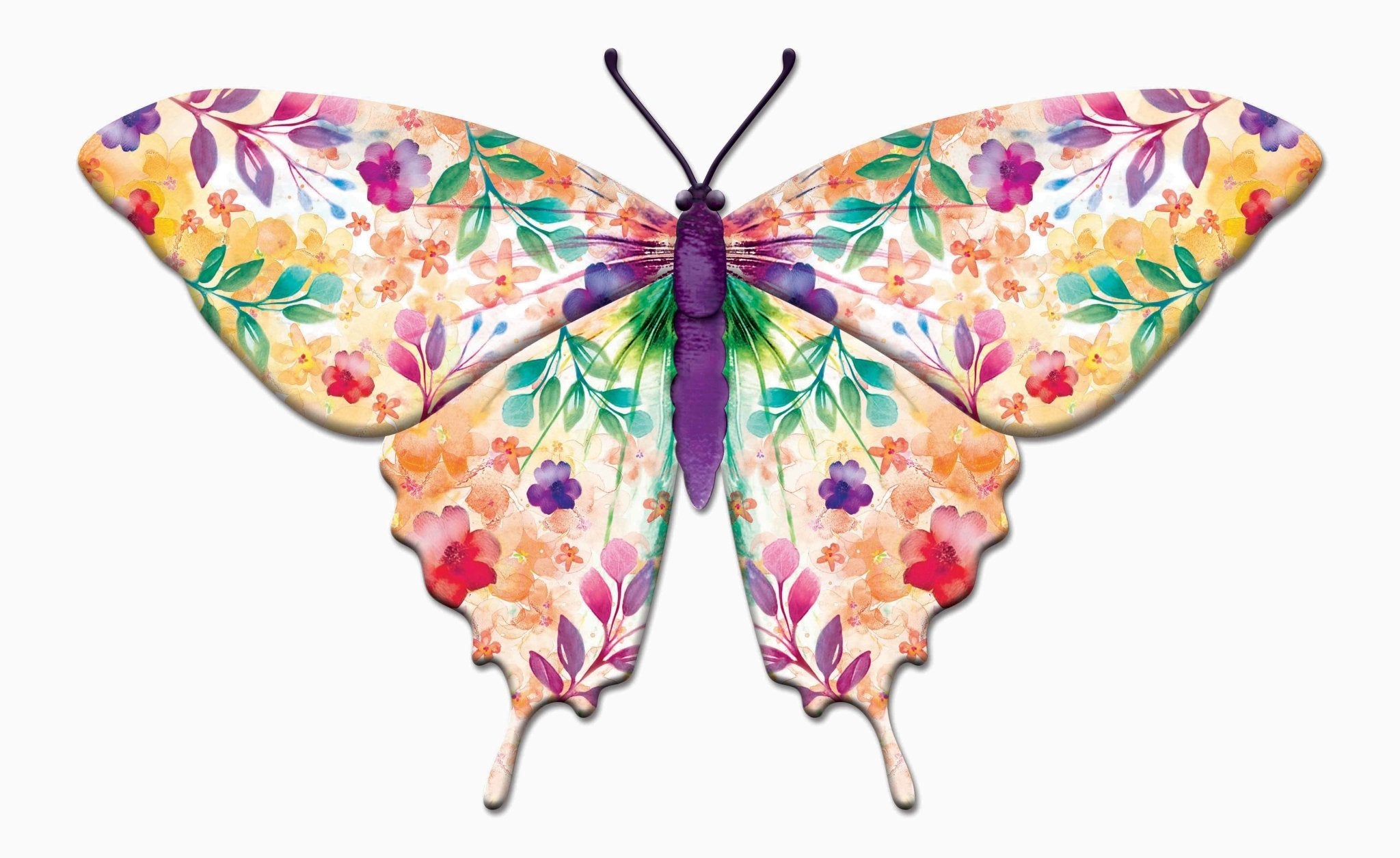 Add a soft watercolor garden feel to your designs with this 13.5-inch Botanical Butterfly Sign. Featuring a dreamy blend of purple, blue, green, and warm orange florals across its wings, this piece creates a vibrant focal point that feels both whimsical and elegant.