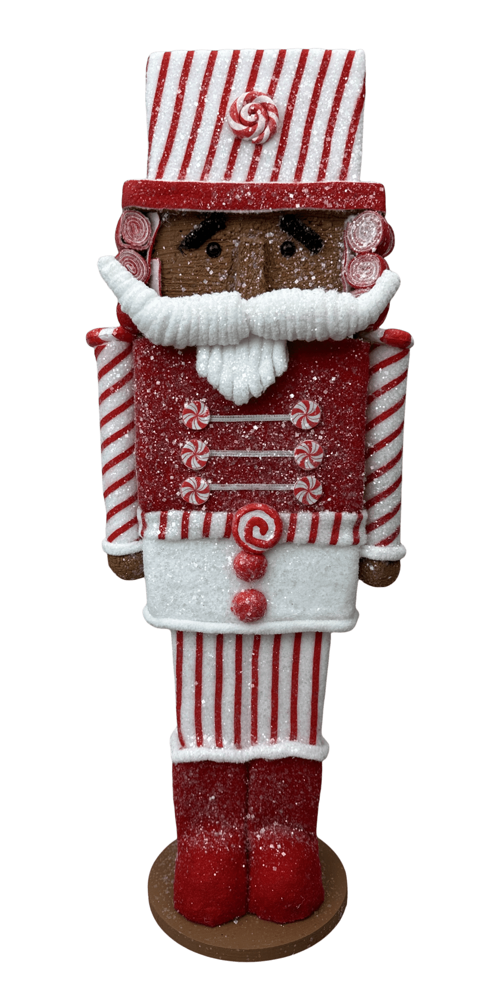Add festive sweetness to your holiday décor with the Gingerbread Nutcracker Decoration (86617RDWT). Standing 19" tall x 7" wide x 5" deep, this candy-inspired figurine is dressed in red and white striped details with peppermint candy buttons and glitter accents. The nutcracker design blends classic tradition with whimsical gingerbread charm, making it perfect for candyland themes, Christmas centerpieces, mantels, or nutcracker collections.