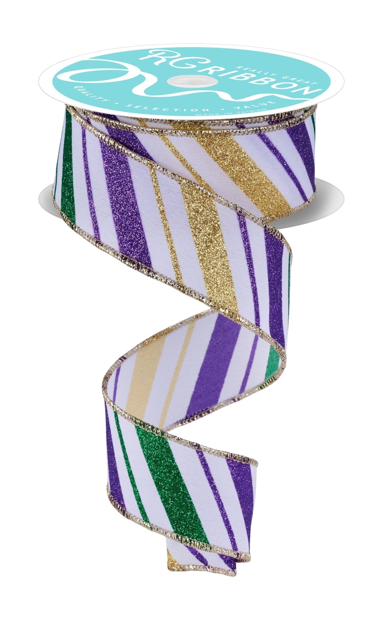 This 1.5-inch Mardi Gras ribbon features bold multi-directional diagonal stripes accented with glitter detailing in classic purple, green, gold, and white. The wired edge provides excellent structure, making it ideal for wreath accents, bows, garlands, and layered designs where movement and sparkle matter.