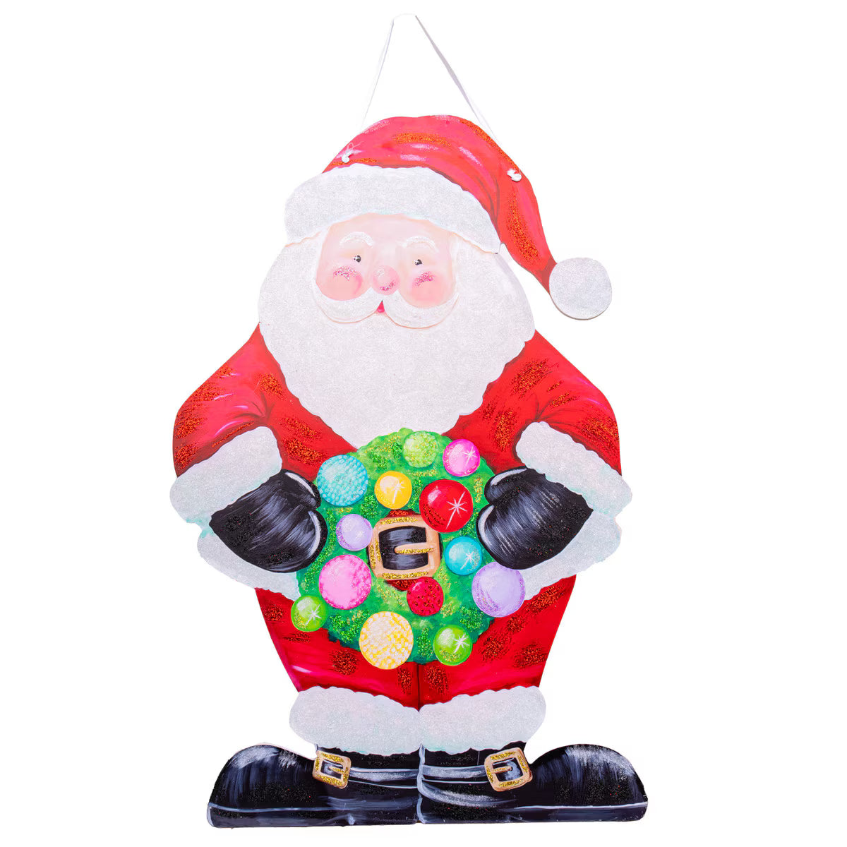The Merry & Bright Santa PVC Door Hanger is a fun, eco-friendly way to decorate for the holidays. Made from recycled PVC and measuring 14" x 0.5" x 22", this lightweight yet durable decoration features Santa holding a vibrant ornament wreath. Perfect for front doors, walls, or covered porches, it’s a cheerful addition to your seasonal décor.