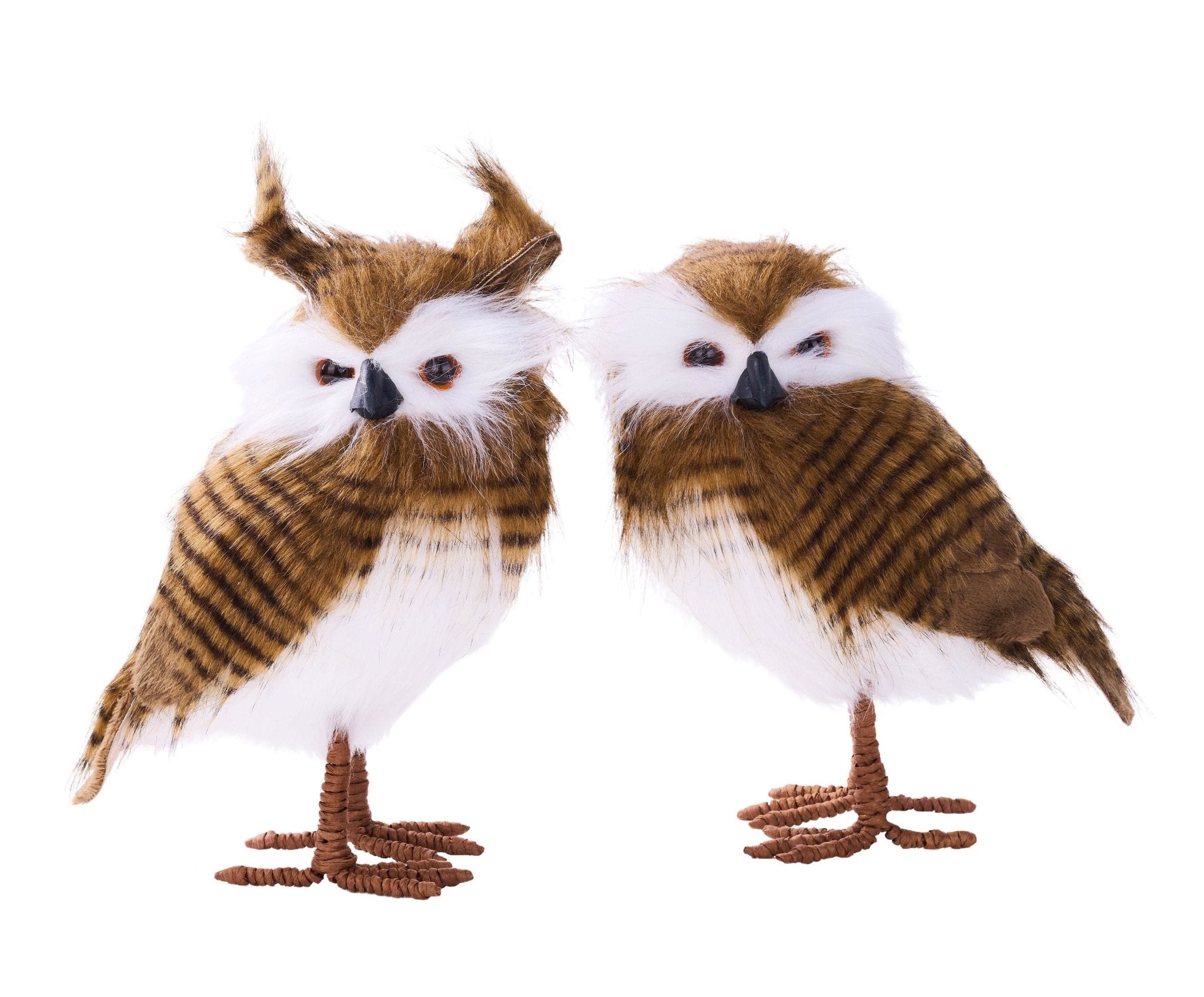 Add a cozy woodland charm to your Christmas décor with this set of two faux fur standing owls. Designed with lifelike detail, soft brown and white plumage, and sturdy wire-wrapped feet, these elegant owls make a beautiful accent for wreaths, centerpieces, or mantel displays. Perfect for winter decorating, nature-inspired designs, or rustic Christmas themes.