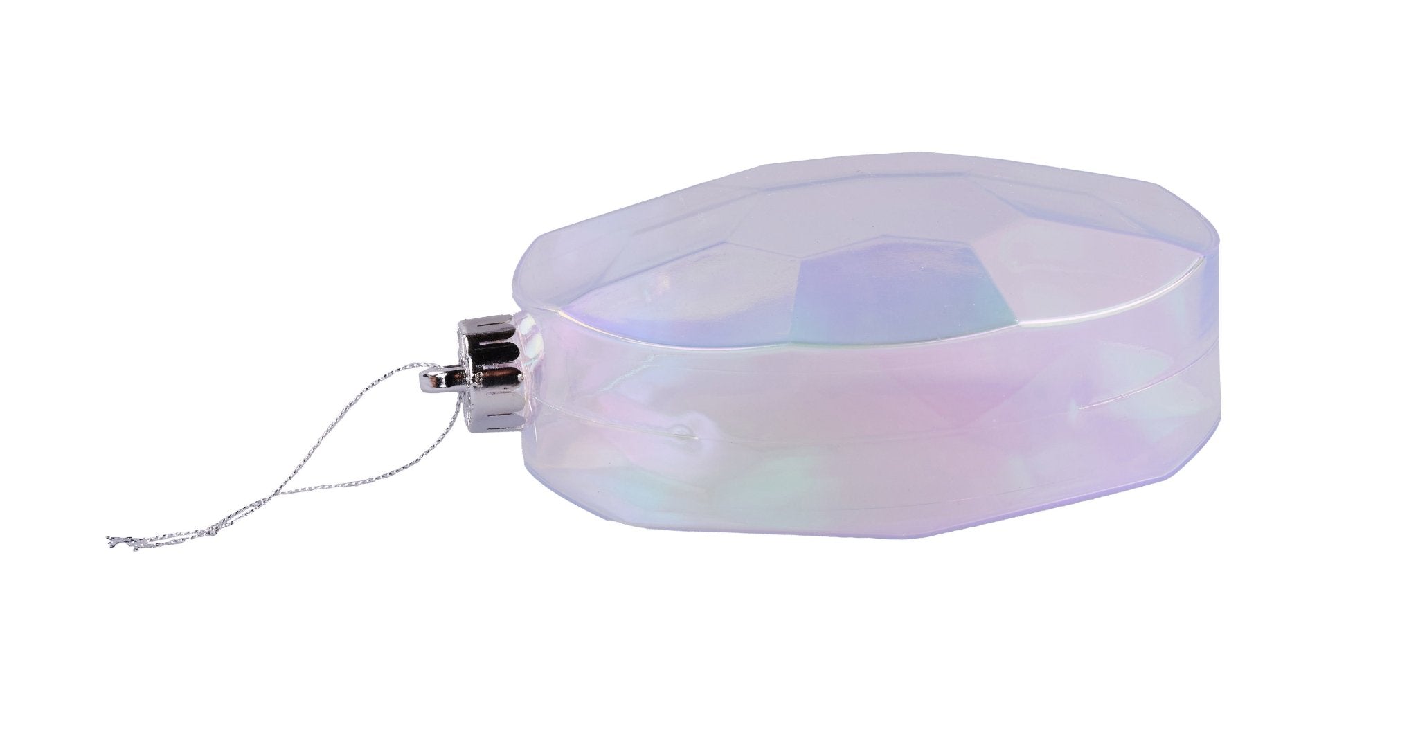 Shimmering with an ethereal glow, this 6.5"L x 4.25"W iridescent oval gem ornament captures light beautifully with its faceted jewel design. Perfect for elegant, modern, or winter wonderland holiday décor.