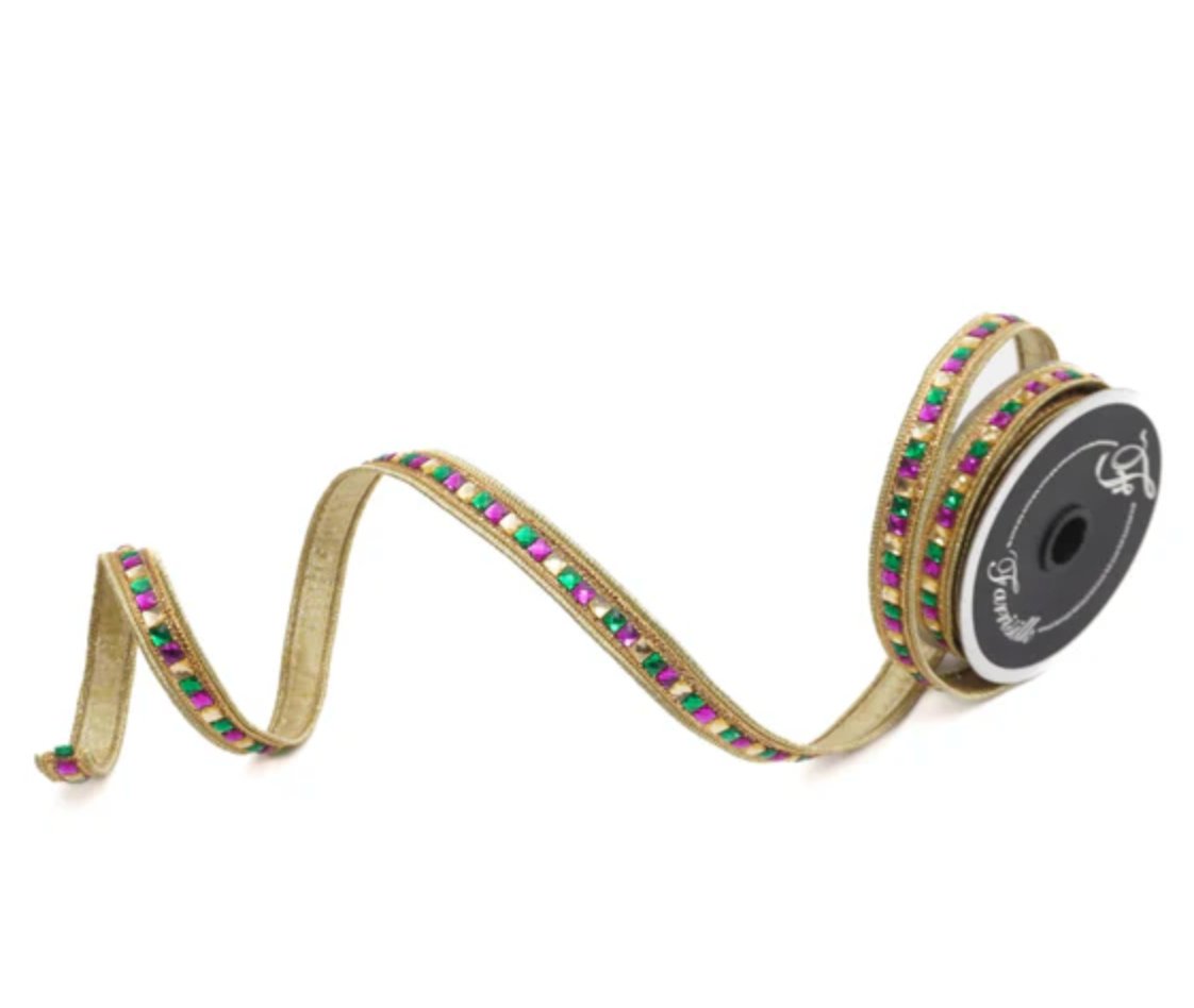 Add a touch of sparkle to your Mardi Gras décor with the Farrisilk .75" Jewelry Garland Ribbon. Featuring jewel-like purple, green, and gold accents on a metallic gold base, this wired ribbon is perfect for trimming masks, wreaths, and party designs.