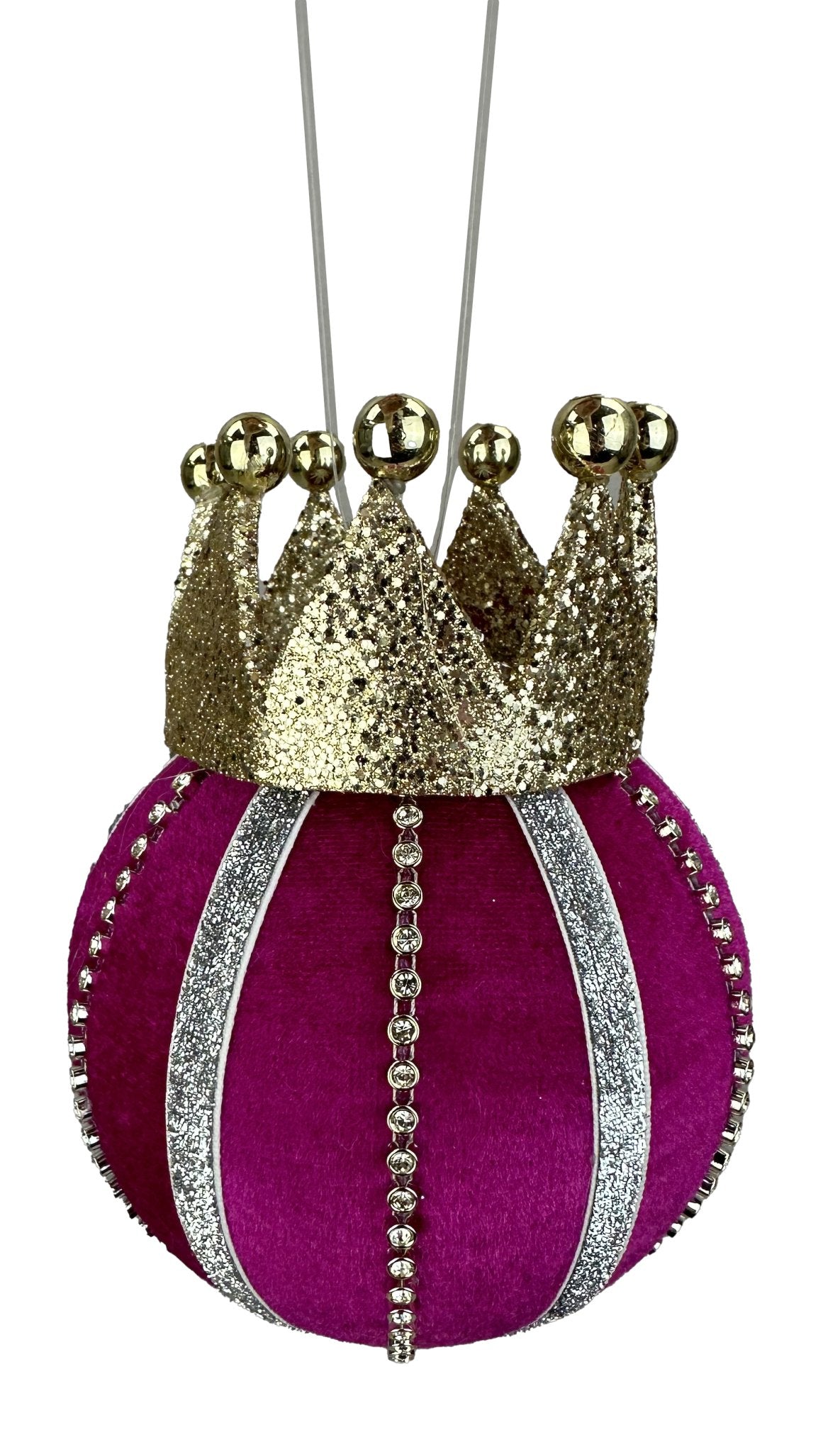Add a regal touch to your holiday decorations with our  7"H x 5" Dia Crown Ball Ornament in Fuchsia and Gold. This unique ornament is the perfect combination of festive colors and elegant design. Make your celebrations truly special with this exclusive ornament.