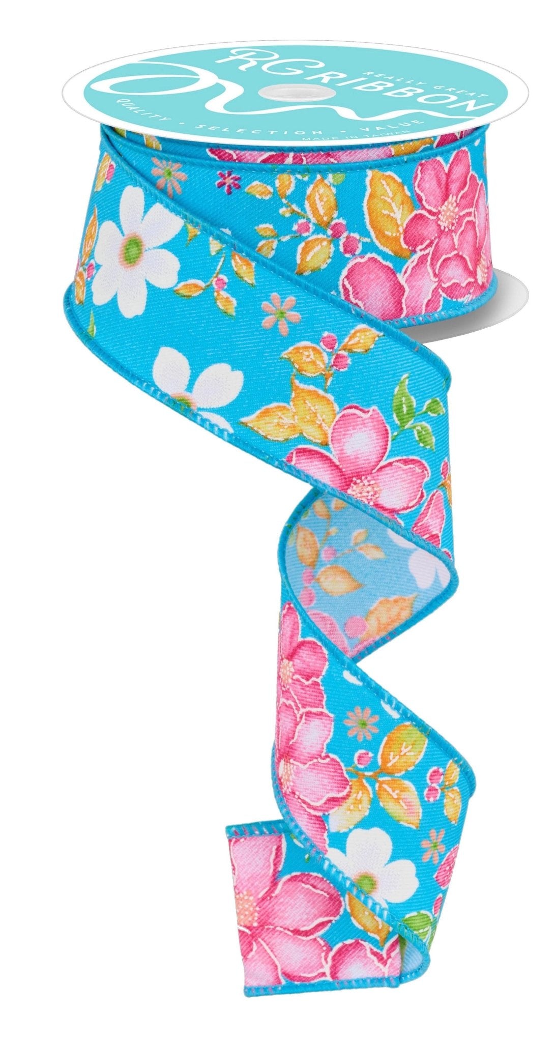Fleurs aquarelles 1,5" : turquoise, rose, vert, orange (10 mètres) RGF115634