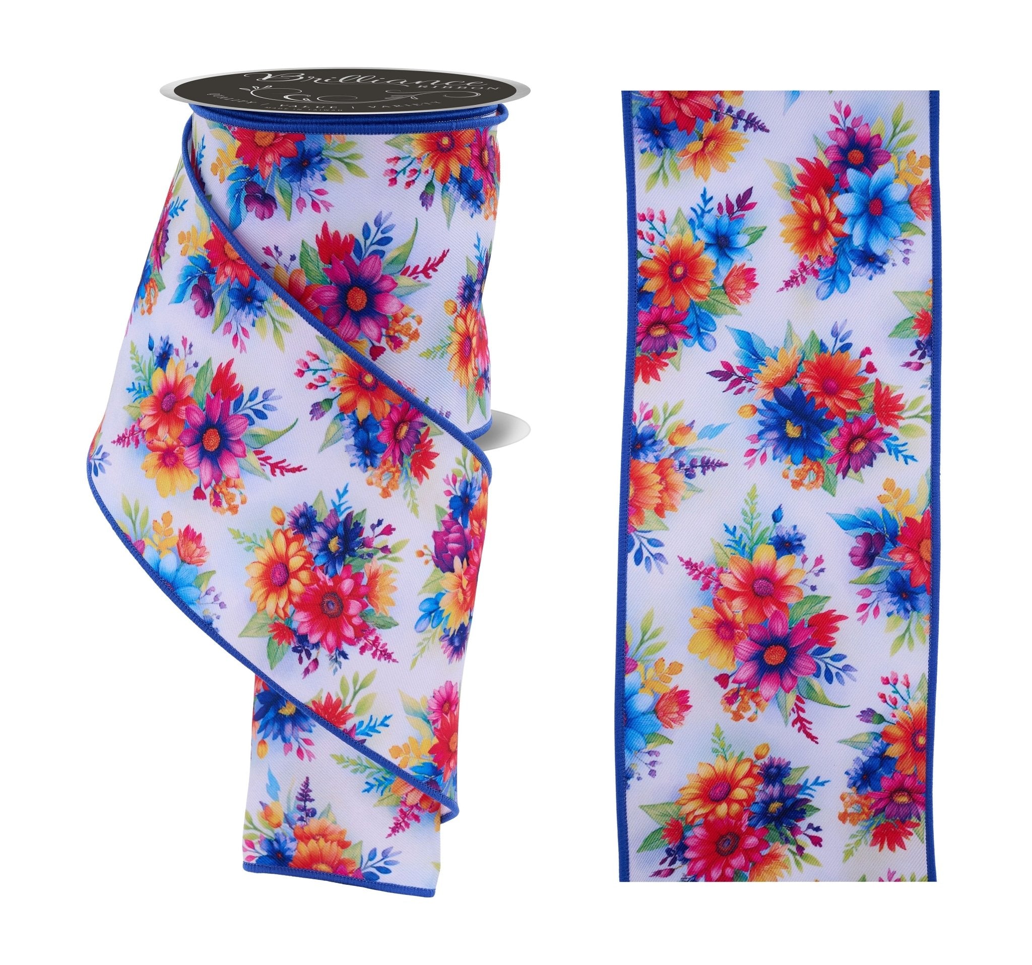 Add bold, cheerful color to your creations with this 4-inch Bright Floral Wired Ribbon. Featuring a vibrant mix of multicolor blooms on a crisp white background, this ribbon instantly brightens spring and summer wreaths, bows, and gift wrapping.