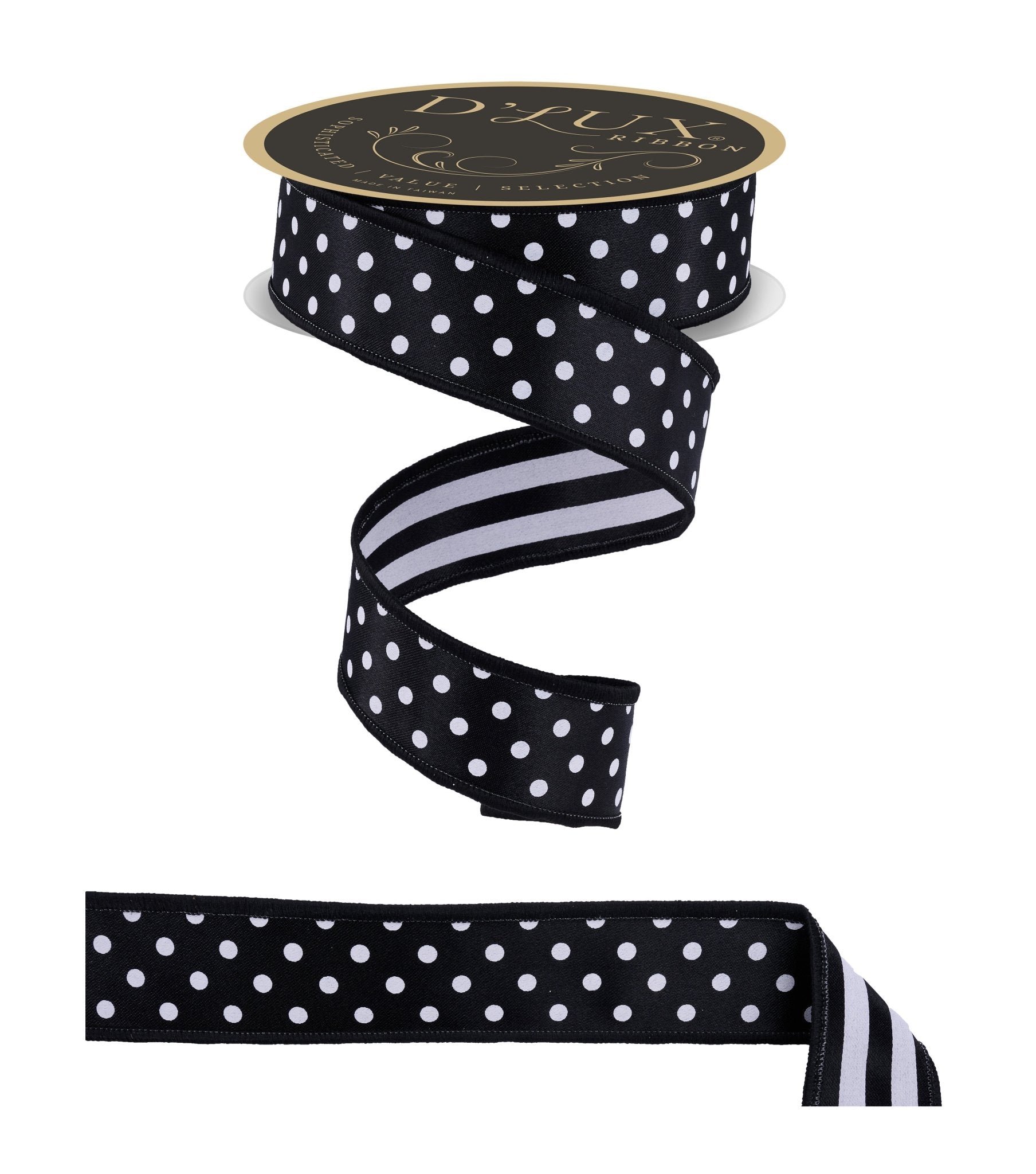 Classic, bold, and full of contrast—this 1.5" D’Lux fused ribbon features a stylish black and white polka dot front with a striped pattern on the back, offering double the design impact in one ribbon! With its premium wired edge and crisp fused construction, this ribbon holds its shape beautifully for bows, curls, and layered designs.